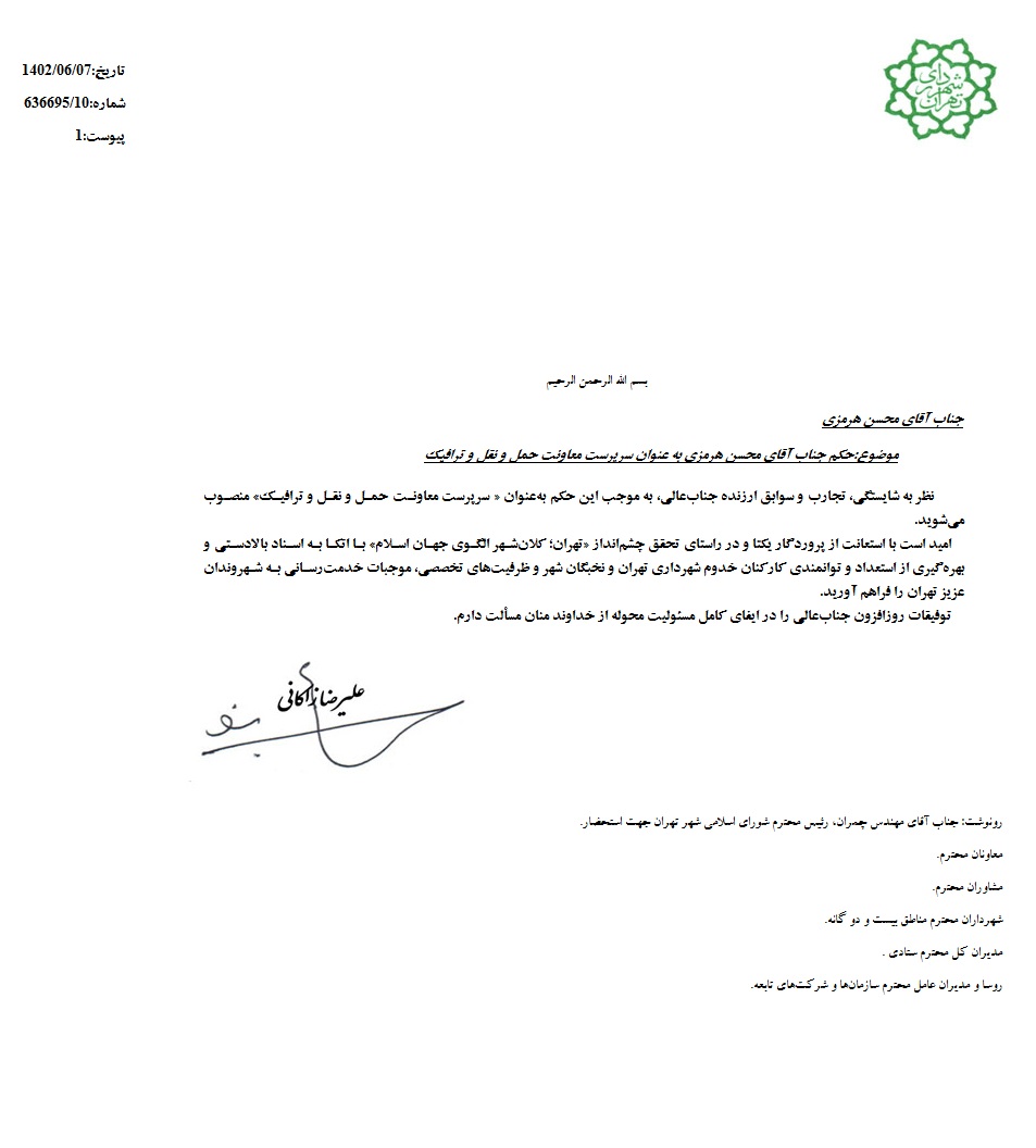 همچنین علیرضا زاکانی شهردار تهران در حکم دیگری مهندس جلال بهرامی را به عنوان مشاور منصوب کرد.