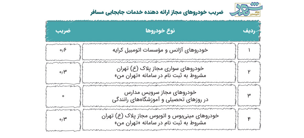 عوارض تردد خودروهای آژانس و مؤسسات اتومبیل کرایه با ضریب ۰.۶ درصد، خودروهای سواری مجاز پلاک (ع) تهران مشروط به ثبت نام در سامانه «تهران من» و خودروهای مجاز سرویس مدارس در روزهای تحصیلی و آموزشگاه‌های رانندگی با ضریب ۰.۳ درصد و خودروهای مینی بوس و اتوبوس مجاز پلاک (ع) تهران مشروط به ثبت نام در سامانه «تهران من» با ضریب صفر پیش بینی شده است.
