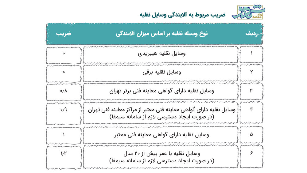 بر اساس جدول ضریب مربوط به آلایندگی وسایل نقلیه، برای تردد وسایل نقلیه هیبریدی و وسایل نقلیه برقی ضریب صفر درصد، وسایل نقلیه دارای گواهی معاینه فنی برتر  تهران ۰.۸  درصد، وسایل نقلیه دارای گواهی معاینه فنی معتبر از مراکز معاینه فنی تهران (در صورت ایجاد دسترسی لازم از سامانه سیمفا) ۰.۹ درصد، وسایل نقلیه دارای گواهی معاینه فنی معتبر ۱ درصد و وسایل نقلیه با عمر بیش از ۲۰ سال (در صورت ایجاد دسترسی لازم از سامانه سیمفا) ۱.۲ درصد تعیین شده است.