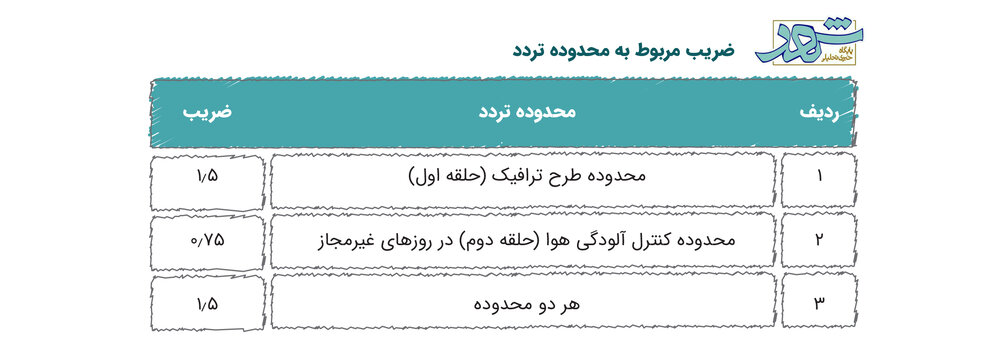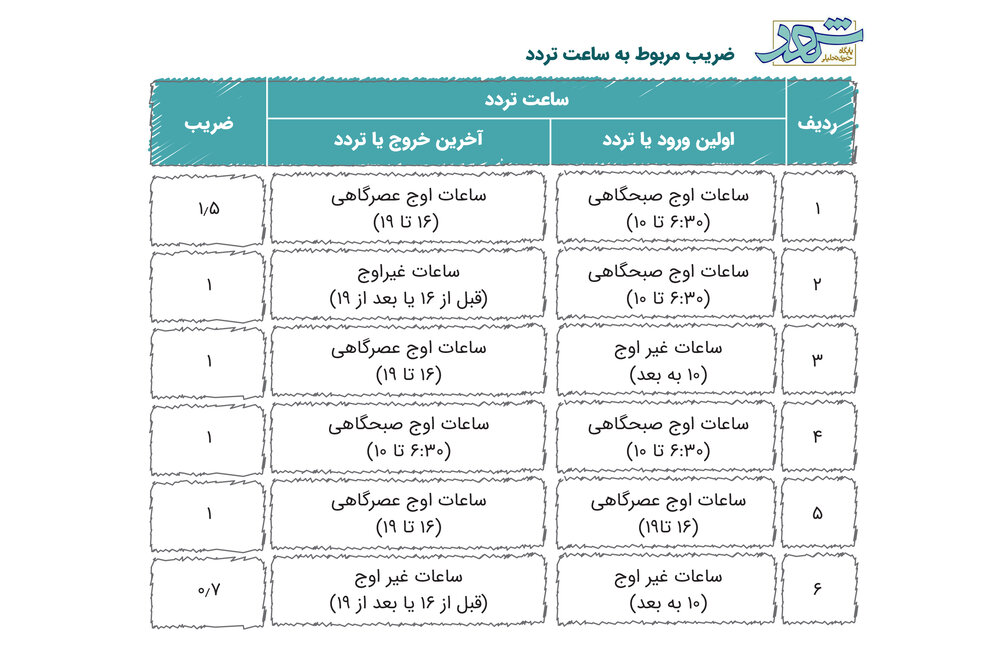 بر اساس جدول ضریب مربوط به ساعت تردد، برای اولین ورود یا تردد در ساعات اوج صبحگاهی (۶:۳۰ تا ۱۰) و آخرین خروج یا تردد از ساعت ۱۶ تا ۱۹ ضریب ۱.۵ درصد، اولین ورود یا تردد در ساعات اوج صبحگاهی (۶:۳۰ تا ۱۰) و آخرین خروج یا تردد در ساعات غیراوج (قبل از ۱۶ یا بعد از ۱۹) ضریب ۱ درصد، اولین ورود یا تردد در ساعات غیر اوج (۱۰ به بعد) و آخرین خروج یا تردد در ساعات اوج عصرگاهی (۶:۳۰ تا ۱۰) ۱ درصد، اولین ورود یا تردد در ساعات اوج عصرگاهی (۱۶ تا ۱۹) و آخرین خروج یا تردد در ساعات اوج عصرگاهی(۱۶ تا ۱۹) ۱ درصد و اولین ورود یا تردد در ساعات غیر اوج (۱۰ به بعد) و آخرین خروج یا تردد در ساعات غیر اوج (قبل از ۱۶ یا بعد از ۱۹) ۰.۷ درصد پیش‌بینی شده است.