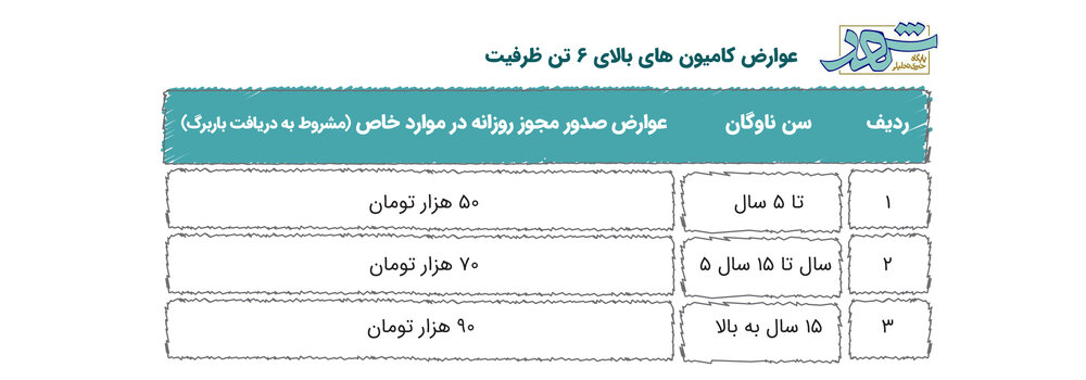 عوارض صدور مجوز روزانه ورود به محدوده کامیون ممنوع در شهر تهران در موارد خاص که به تشخیص سازمان مدیریت حمل و نقل بار و پایانه های مسافری شهر تهران صادر می شود، تا پنج سال مبلغ ۵۰ هزار تومان، پنج تا ۱۵ سال ۷۰ هزار تومان و ۱۵ سال به بالا ۹۰ هزار تومان است.