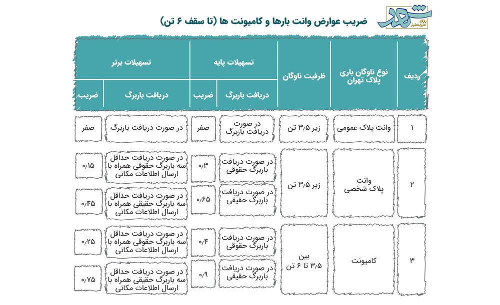 عوارض تردد وانت پلاک عمومی با ظرفیت زیر ۲.۵ تن در صورت دریافت باربرگ سفر، وانت پلاک شخصی زیر ۳.۵ تن در صورت دریافت باربرگ حقوقی ۰.۳ درصد و در صورت دریافت حداقل سه باربرگ حقوقی همراه با ارسال اطلاعات مکانی ۰.۱۵ درصد و در صورت دریافت باربرگ حقیقی ۰.۶۵ درصد و همچنین دریافت حداقل سه باربرگ حقوقی همراه با ارسال اطلاعات مکانی ۰.۴۵ درصد محاسبه خواهد شد.