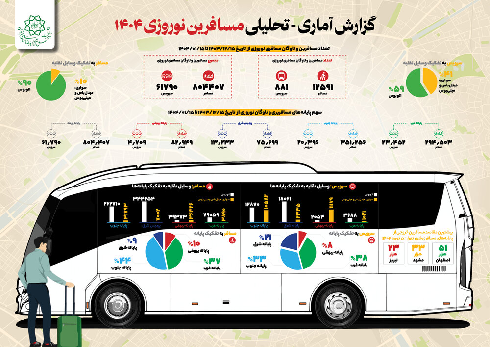وی در بخش دیگری از سخنان خود با اشاره به پراستقبال ترین شهر مقصد سفر، یادآور شد: بیشترین مقاصد مسافرین خروجی در نوروز ۱۴۰۴ به شهرهای اصفهان با تعداد ۵۱ هزار نفر مسافر، مشهد با تعداد ۳۳ هزار نفر مسافر و تبریز با تعداد ۲۳ هزار نفر مسافر اختصاص پیدا کرد.