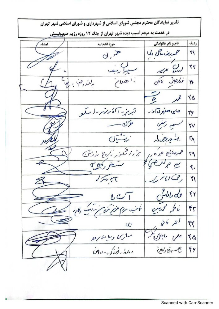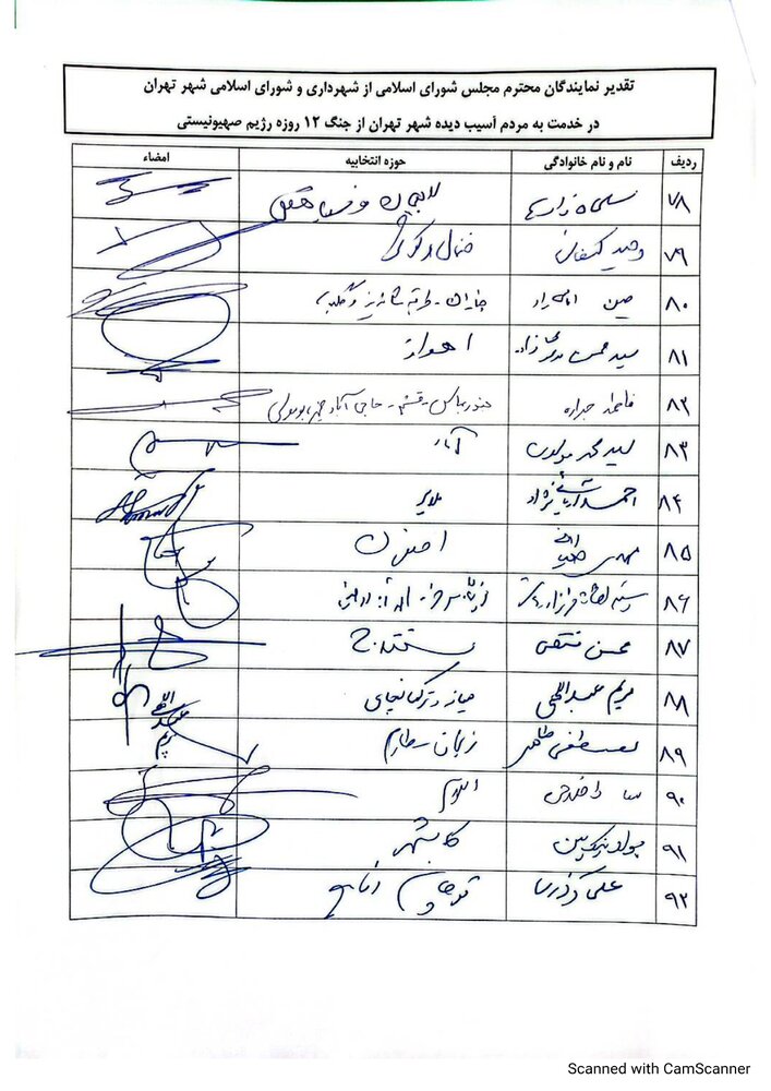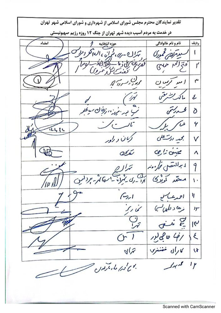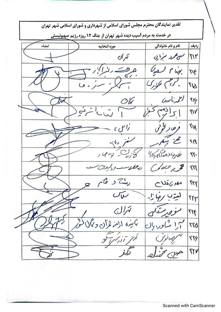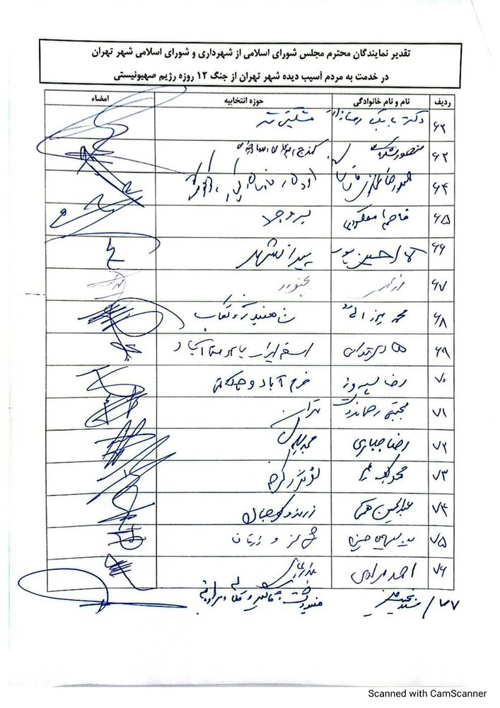 ما نمایندگان مجلس شورای اسلامی، از تلاش‌های خستگی‌ناپذیر و خدمات ارزشمند شهردار، مدیران وکارکنان شهرداری تهران در دوران جنگ ۱۲ روزه و پس از آن و حمایت و پشتیبانی شورای اسلامی شهر تهران از این اقدامات صمیمانه تشکر کرده و این خدمات را نمونه‌ای از وفاداری به آرمان‌های انقلاب اسلامی می‌دانیم. امیدواریم با تداوم این رویکرد انقلابی و خدمتگزار، شاهد پیشرفت و استحکام هرچه بیشتر کشور عزیزمان ایران باشیم.